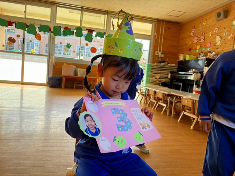 お祝いの冠を嬉しそうに被り、誕生会中はもちろんの事、その後の給食時も遊びの時間もニコニコと被って過ごしていましたよ。