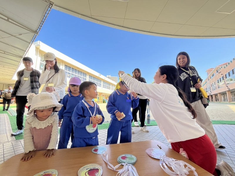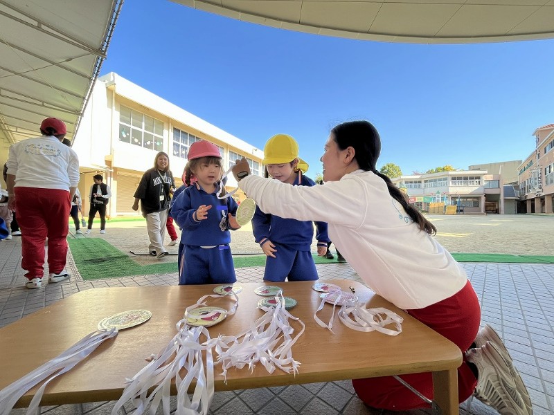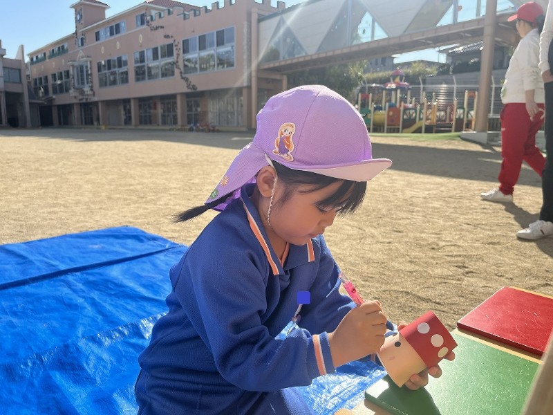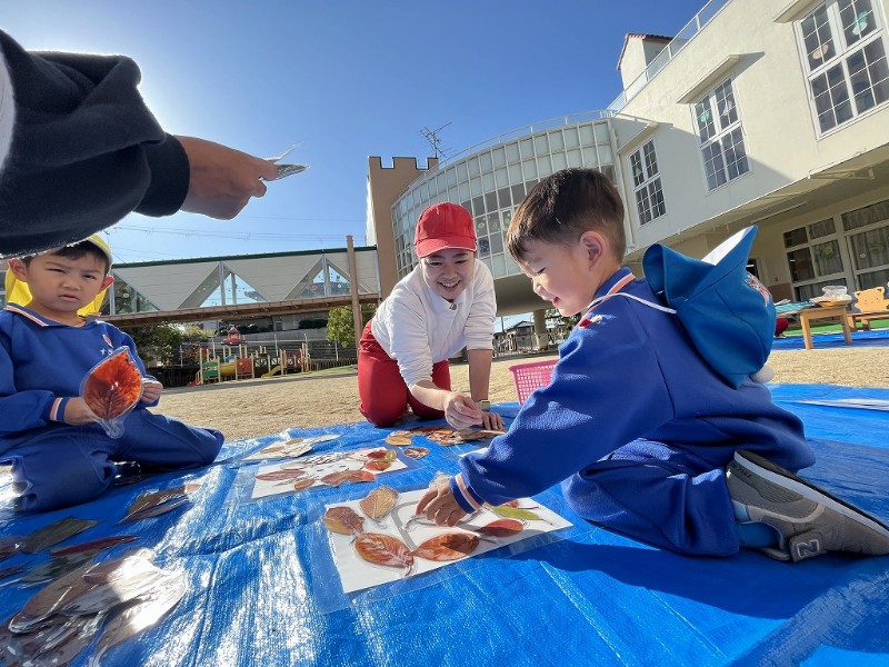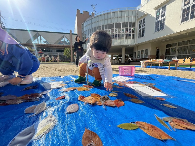 園庭では三輪車やボール、遊具、砂場の思い思いの場所で遊んだり、太陽の下で『ゆらゆらきのこ』の製作や落ち葉を並べて動物の顔を作ったりと秋遊びも楽しんでいる姿が見られました。