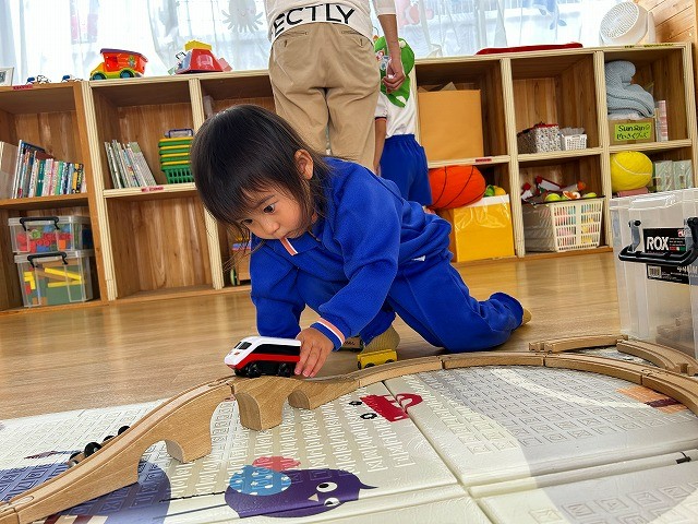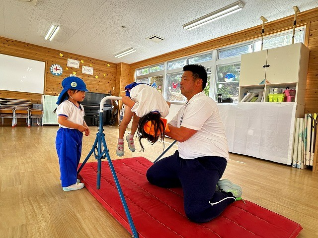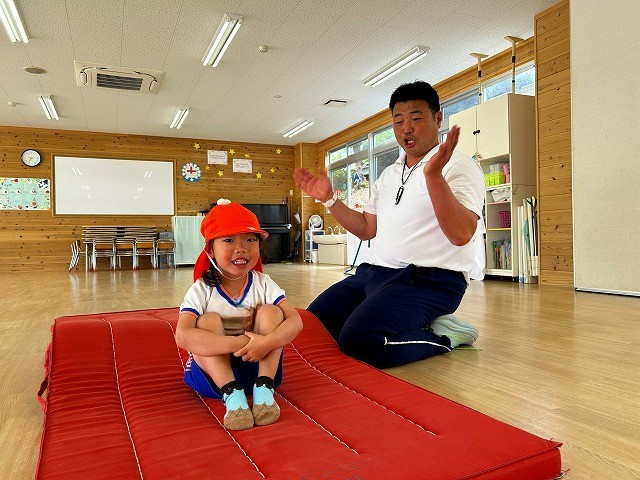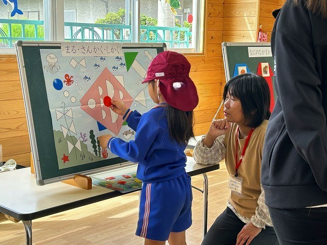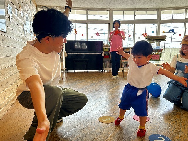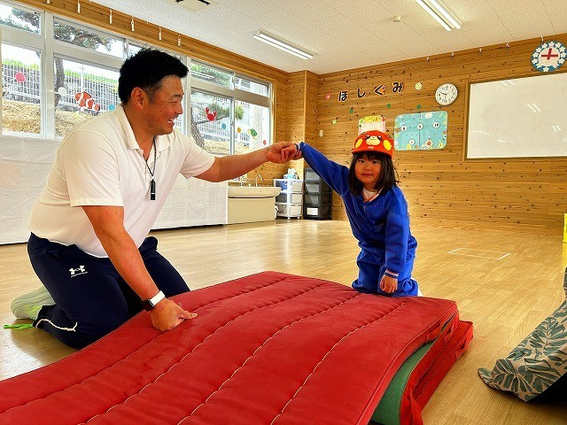 数字が書いてあるポイントマットの上でリズムに合わせてステップを踏んだり、マットや鉄棒を使って身体を動かしたり、ひらがなが書いてあるブロックを使って単語を作ったりと様々な体験を楽しむことが出来ましたね![]()