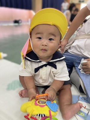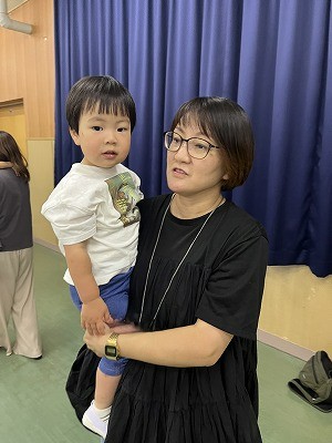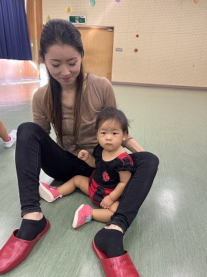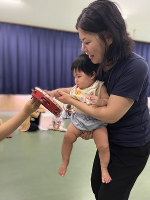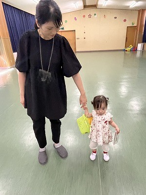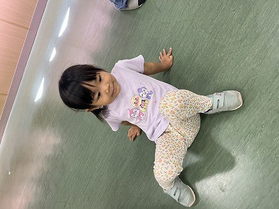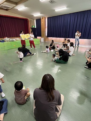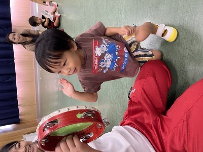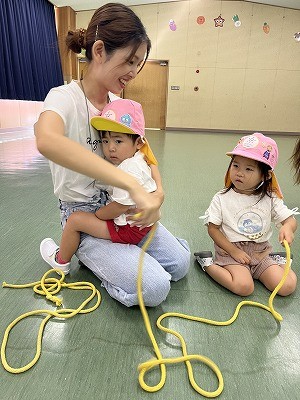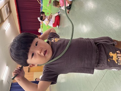 手遊びや触れ遊びを楽しんだり、縄跳びを使ってお家の人と縄を引っ張ってみたり、丸い形に作った縄を跳んでみたり、中に入ってみたりと初めての縄跳び遊びを経験したお友達もいましたが、沢山の可愛い笑顔が見られました