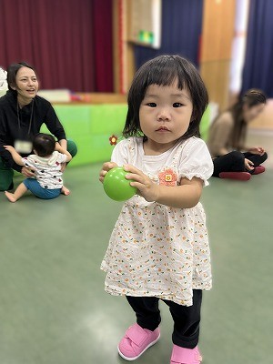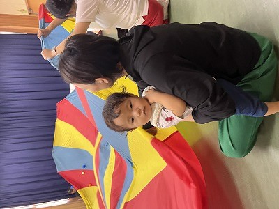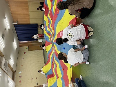 他にも、パラバルバルーンを楽しみました!カラフルな大きなパラバルーンを 横にゆらゆらしたり、みんなで持ってお家を作ったり、ボールを高くとばして遊びましたよ