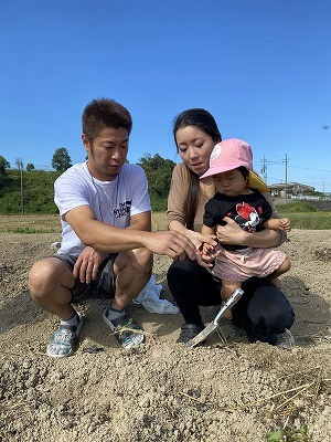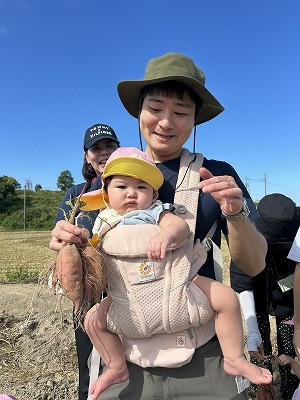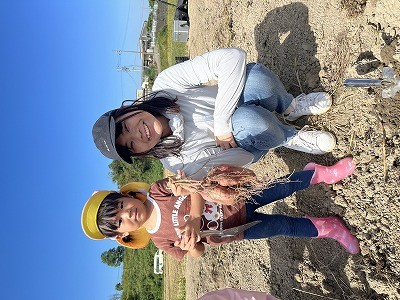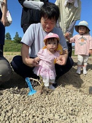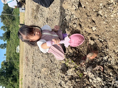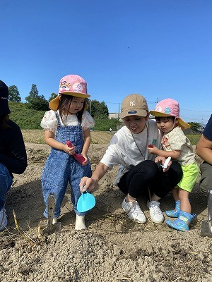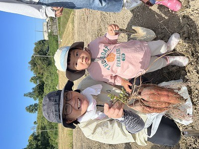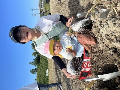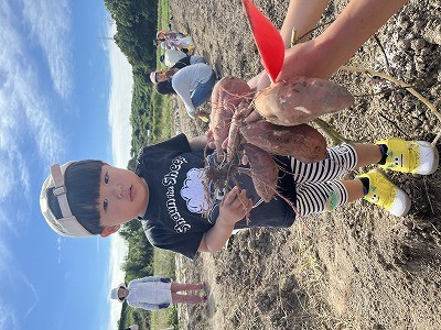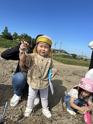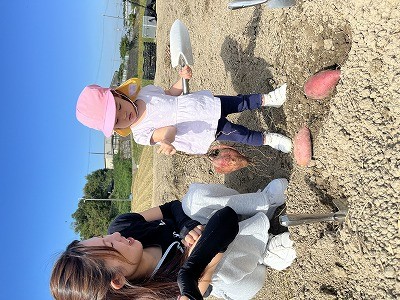 3回目の活動は、「さつまいも掘り」に出掛けました。秋晴れに恵まれて、畑に着くと早速お家の方と一緒にさつまいもの収穫に挑戦!スコップや手で、土や感触を楽しみながら夢中で掘っている姿が見られましたさつまいもが土から見えると嬉しそうな笑顔で、頑張って引っ張ったり「採れた~!」と喜ぶ姿が可愛かったですね。