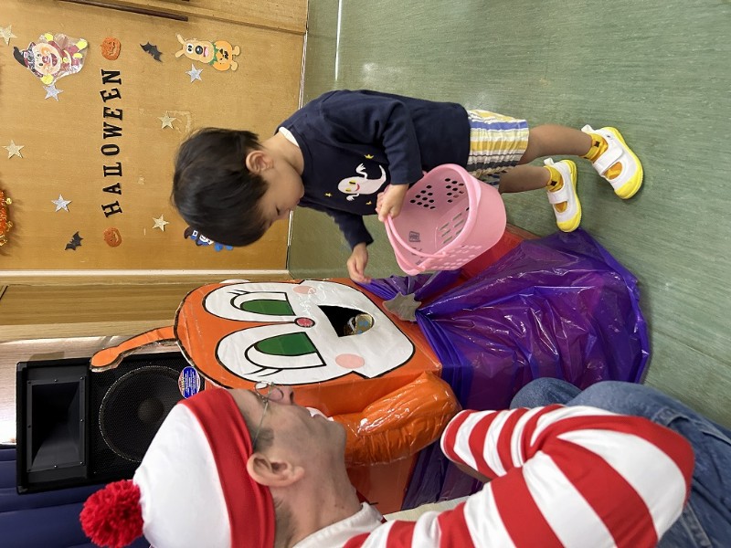 最後には、デイビッド先生ウォーリーからお菓子のプレゼントです。「Trick or Treat!(お菓子をくれなきゃ、いたずらするぞ)」と、少し難しい言葉にも挑戦して、ハロウィンを楽しむ事ができました![]()